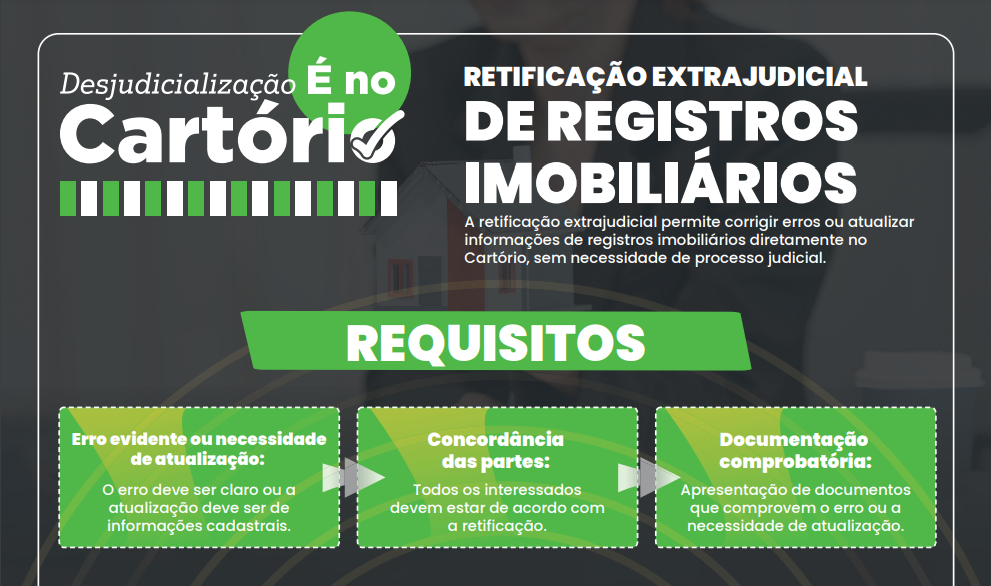 No material, também é possível encontrar os requisitos, detalhes sobre o passo a passo necessário para a retificação e também as vantagens da prática do ato extrajudicial.