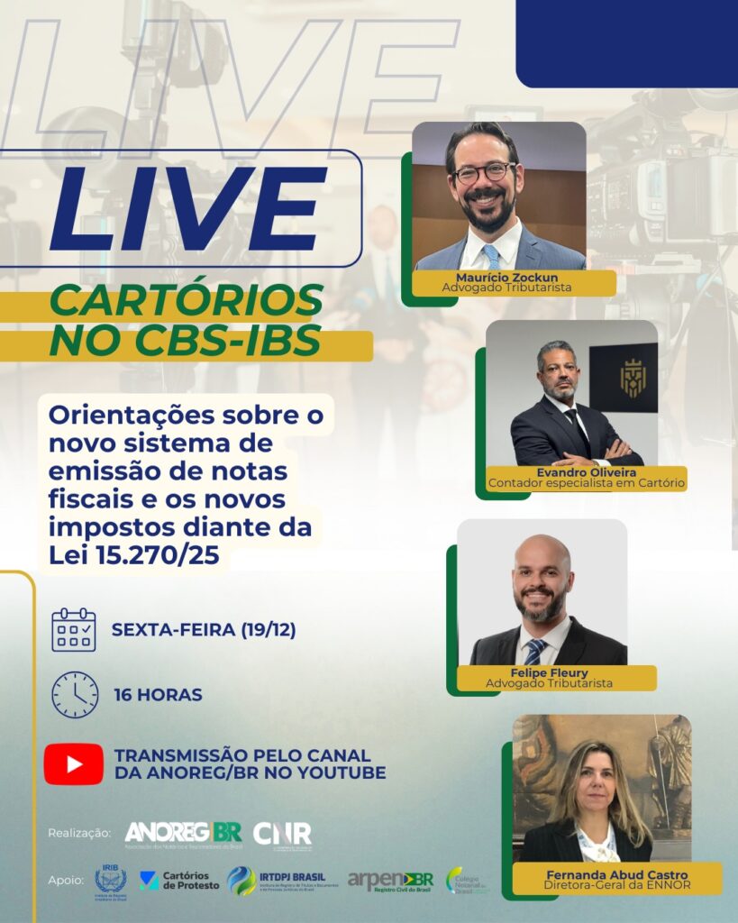 A ANOREG/BR e a CNR, com apoio de todos Institutos, realiza nesta sexta-feira (19.12) a Live CARTÓRIOS NO CBS-IBS com orientações sobre o novo sistema de emissão de notas fiscais e os novos impostos diante da Lei 15.270/25. Uma oportunidade única para esclarecer suas dúvidas e se preparar para as mudanças!