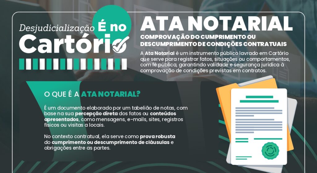 A Associação dos Notários e Registradores do Brasil (ANOREG/BR) acaba de disponibilizar um novo infográfico explicativo sobre a Ata Notarial, com foco na sua utilização para comprovar o cumprimento ou descumprimento de condições contratuais.