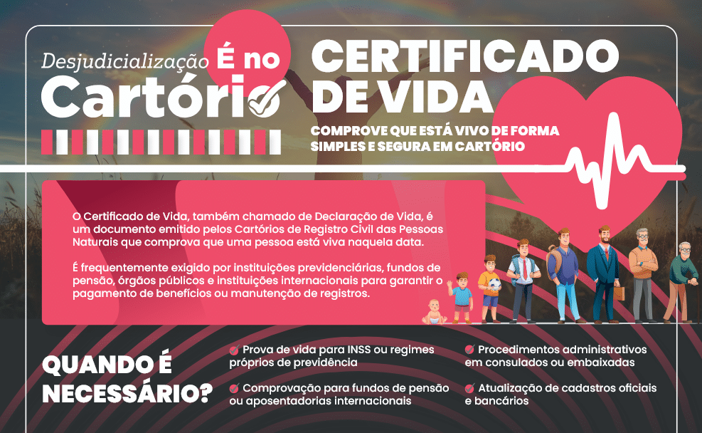 A Associação dos Notários e Registradores do Brasil (ANOREG/BR) acaba de disponibilizar um novo infográfico explicativo sobre o Certificado de Vida, também conhecido como Declaração de Vida, documento emitido pelos Cartórios de Registro Civil das Pessoas Naturais que comprova que uma pessoa está viva na data da emissão.