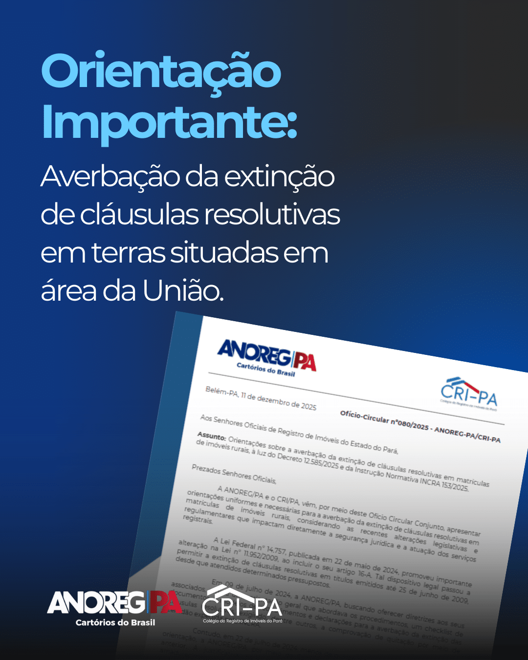 A Associação dos Notários e Registradores do Pará (ANOREG/PA) e o Colégio Registral Imobiliário do Pará (CRI/PA) divulgaram, nesta quarta-feira (11), o Ofício-Circular nº 080/2025, documento que estabelece orientações uniformes para todos os Oficiais de Registro de Imóveis do Estado sobre os procedimentos necessários para a averbação da extinção de cláusulas resolutivas em matrículas de imóveis rurais.