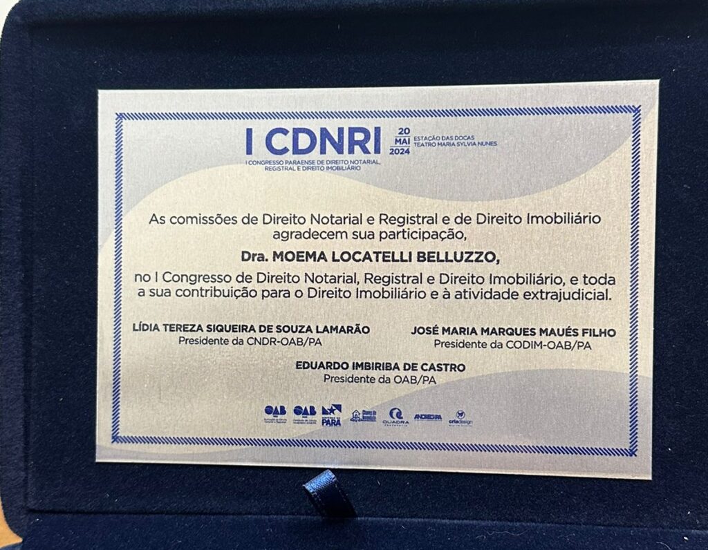 Homenagem de participação – Durante o Congresso, a presidente da ANOREG/PA foi agraciada com uma placa de homenagem por sua participação no evento e por toda a contribuição para o Direito Imobiliário e à atividade extrajudicial.