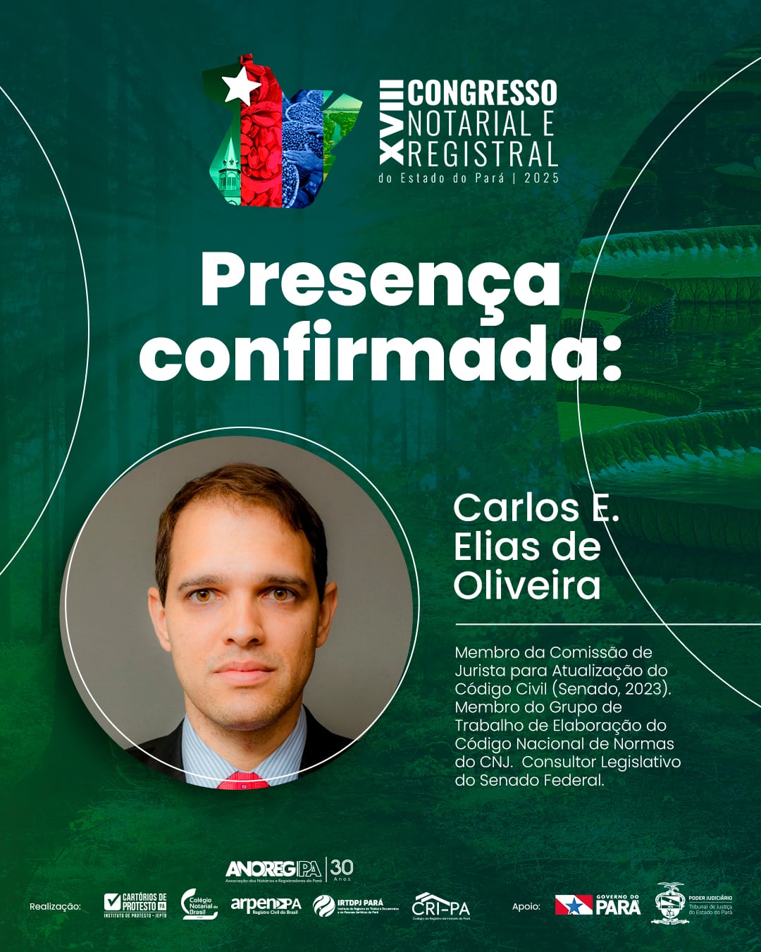 Entre as grandes presenças confirmadas está Carlos E. Elias de Oliveira, um dos principais nomes do Direito Civil, Notarial e Registral no Brasil. Consultor Legislativo do Senado Federal, ele integra a Comissão de Juristas para Atualização do Código Civil e o Grupo de Trabalho para Elaboração do Código Nacional de Normas do CNJ. Além disso, é pós-doutorando em Direito Civil pela USP, doutor, mestre e bacharel em Direito pela UnB, professor e autor de diversas obras jurídicas.