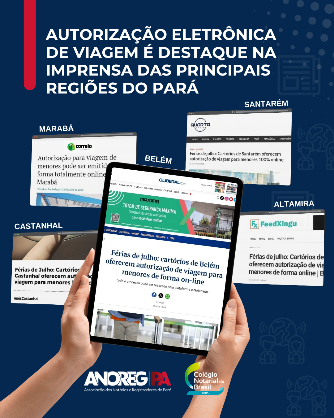 A matéria do jornal O Liberal, um dos principais do estado, evidenciou a funcionalidade da plataforma digital e como ela se tornou uma aliada das famílias durante as férias: “Cartórios de Belém oferecem autorização de viagem para menores de forma on-line”. Já o Correio Paraense reforçou a abrangência estadual do serviço: “Cartórios do Pará oferecem autorização de viagem para menores 100% online”.