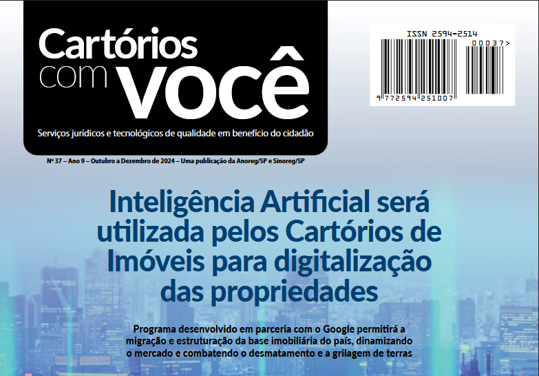 A 37ª edição da revista Cartórios com Você, produzida pela Associação dos Notários e Registradores de São Paulo (Anoreg/SP) e pelo Sindicato dos Notários e Registradores do Estado de SP (Sinoreg/SP), já está disponível!
