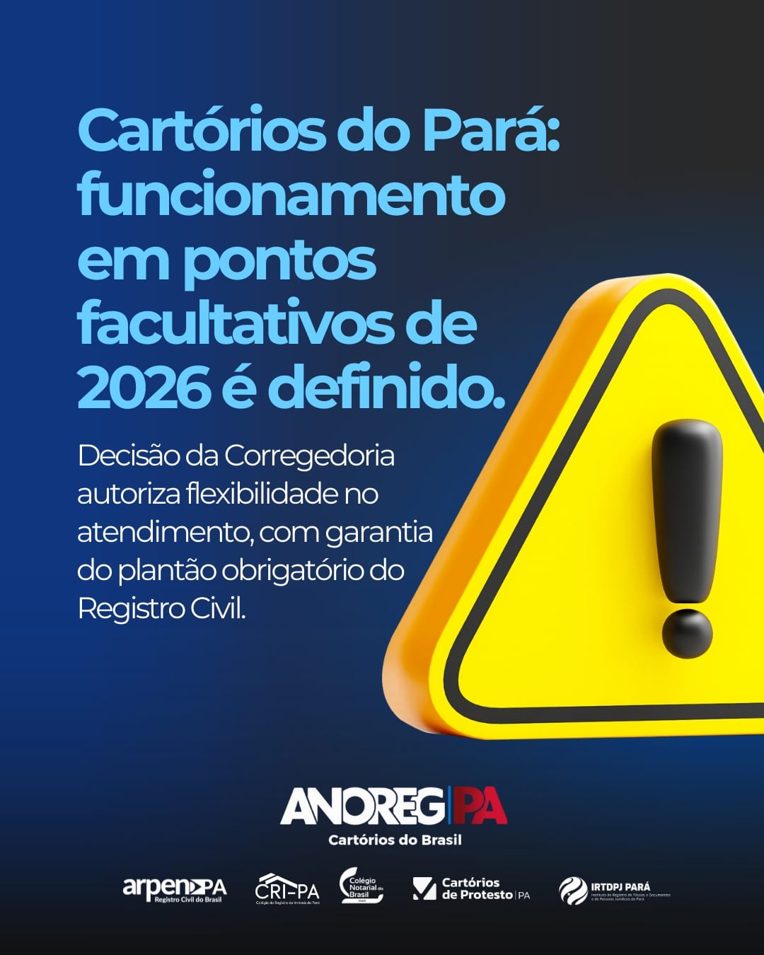 A Corregedoria-Geral da Justiça do Estado do Pará decidiu como devem funcionar os Cartórios nos pontos facultativos e em datas comemorativas ao longo do ano de 2026. A decisão atende a um Pedido de Providências apresentado pela Associação dos Notários e Registradores do Pará (ANOREG/PA), em conjunto com seus Institutos Membros.