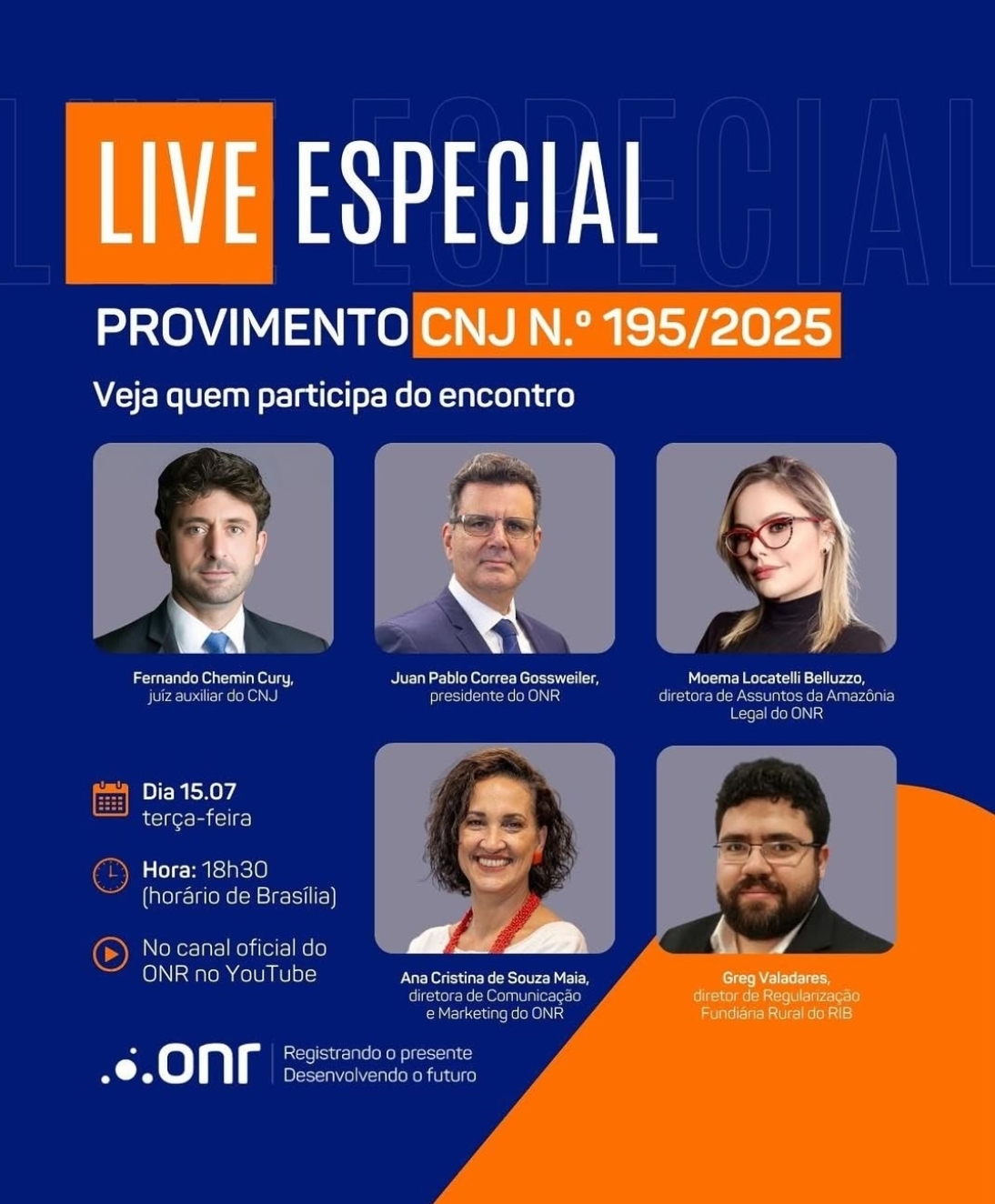 A live será transmitida ao vivo pelo canal do ONR no YouTube, que é responsável pela produção do evento. Também participarão do debate o juiz auxiliar da Corregedoria Nacional de Justiça, Fernando Chemin Cury; o presidente do ONR, Juan Pablo Correa Gossweiler; a diretora de Assuntos da Amazônia Legal do ONR, Moema Locatelli Belluzzo; e a diretora de Comunicação e Marketing do ONR, Ana Cristina de Souza Maia.
