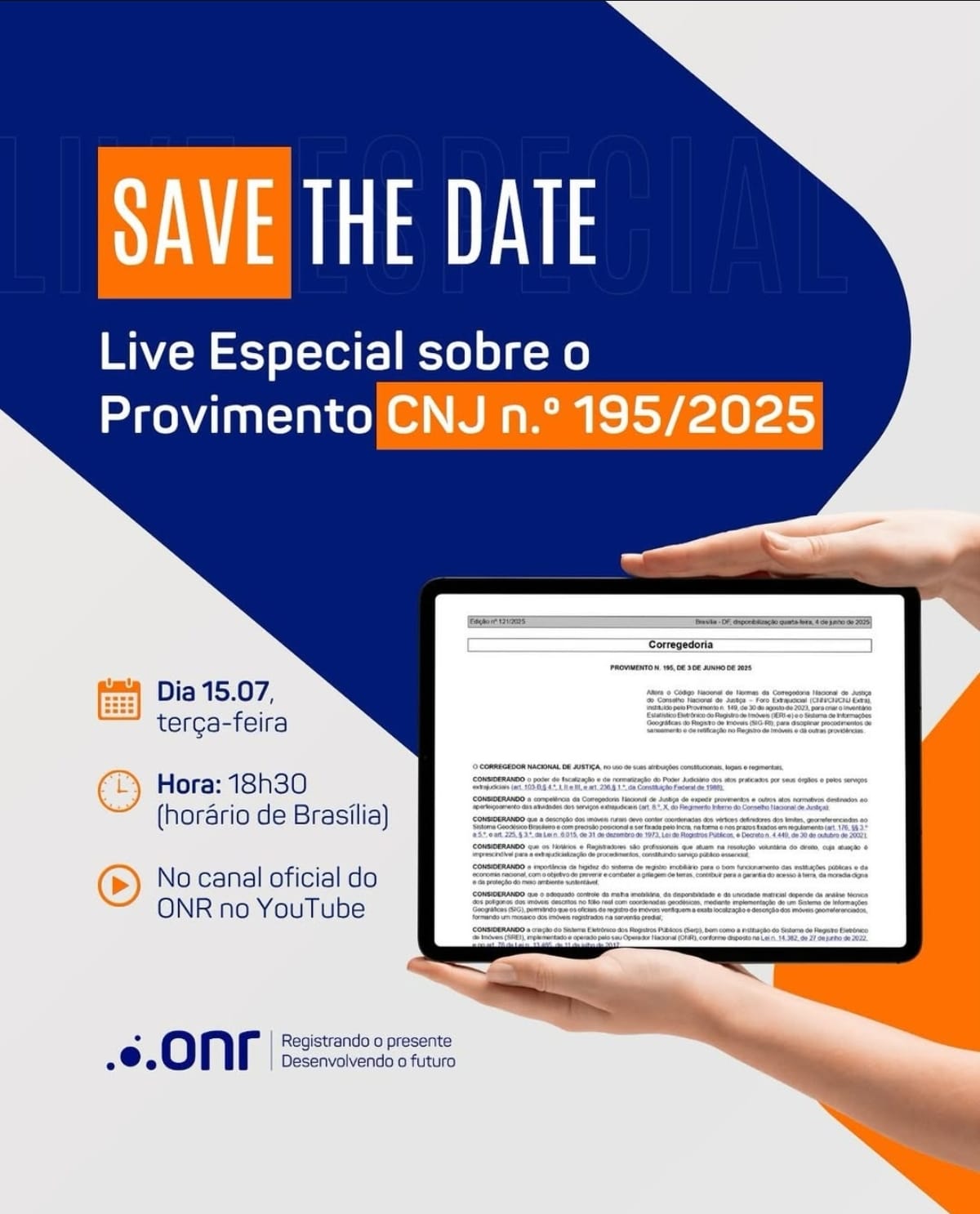 O Operador Nacional do Registro Eletrônico de Imóveis (ONR) convida todos os registradores de imóveis do Brasil para um encontro essencial que marcará um novo capítulo na modernização da atividade registral no país. A live, que contará com a participação do Conselho Nacional de Justiça (CNJ), será transmitida ao vivo pelo YouTube e abordará os principais pontos do Provimento nº 195 da Corregedoria Nacional de Justiça.