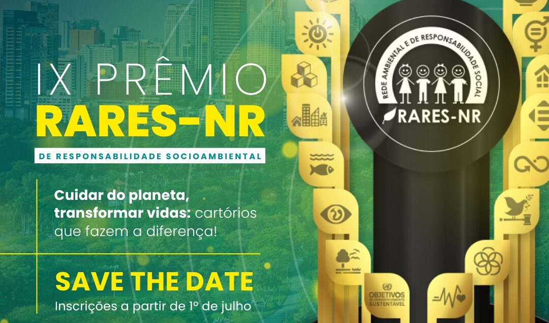 A ANOREG/BR, por meio da Rares – NR (Rede Ambiental de Responsabilidade Social dos Notários e Registradores), tem a satisfação de anunciar a abertura das inscrições para a IX edição do Prêmio Rares, com o tema: “Cuidar do planeta, transformar vidas: Cartórios que fazem a diferença!”.