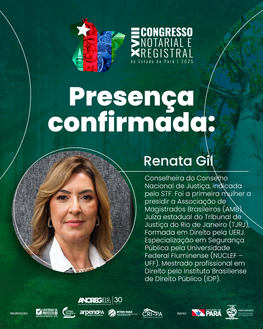 Nos dias 10 e 11 de junho de 2025, o Teatro Maria Sylvia Nunes, na Estação das Docas, em Belém, será palco do XVIII Congresso Notarial e Registral do Pará, o maior evento do segmento na região Norte. Entre os nomes confirmados está o da Conselheira do Conselho Nacional de Justiça (CNJ), Renata Gil, figura de destaque no Judiciário brasileiro.Indicada ao CNJ pelo Supremo Tribunal Federal (STF), Renata Gil foi a primeira mulher a presidir a Associação dos Magistrados Brasileiros (AMB). Atualmente, atua como Ouvidora Nacional da Mulher e é responsável pela supervisão da Política Judiciária Nacional de Enfrentamento à Violência contra as Mulheres no Poder Judiciário, uma frente essencial no combate à desigualdade e na defesa dos direitos das mulheres no país.