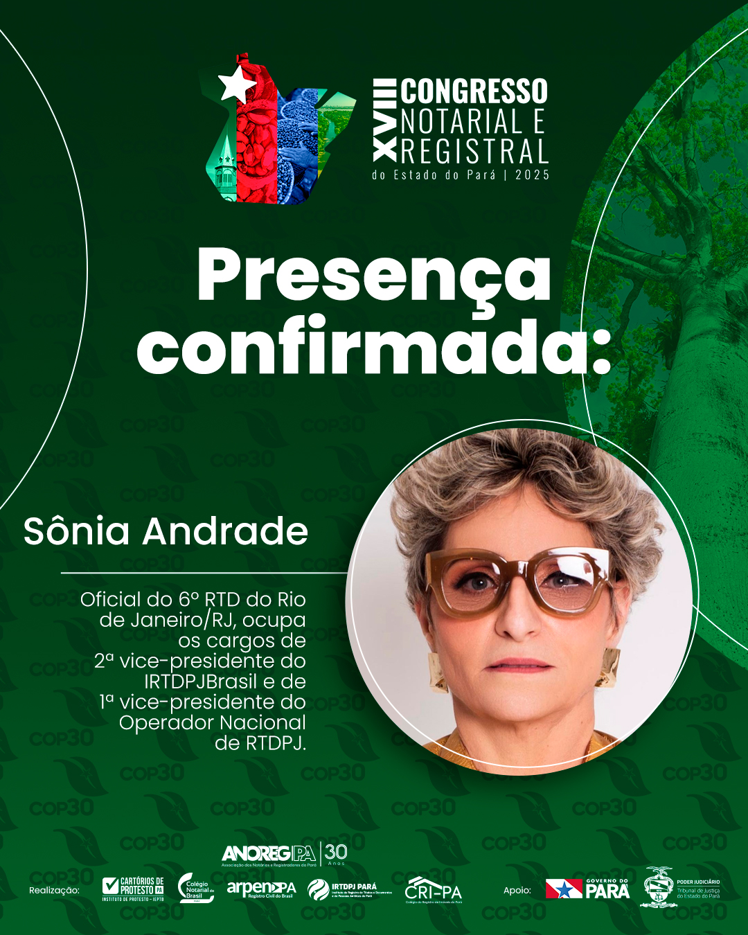 Com presença confirmada no XVIII Congresso Notarial e Registral do Pará, Sônia Andrade será uma das palestrantes de destaque do evento, que acontece nos dias 10 e 11 de junho!