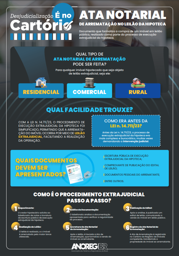 A Associação dos Notários e Registradores do Brasil (ANOREG/BR) disponibiliza mais um infográfico do projeto, destacando a Ata Notarial de Arrematação no Leilão da Hipoteca. A iniciativa visa orientar os cidadãos sobre os atos praticados nos Tabelionatos e Cartórios de Registro brasileiros, e aqueles que contribuem com a desjudicialização no Brasil, permitindo que o cidadão consiga solucionar suas demandas de forma mais ágil, simples e econômica.