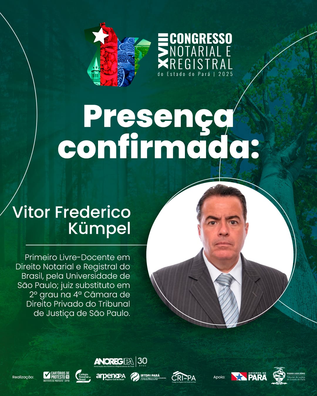 Uma das grandes presenças confirmadas é a de Vitor Frederico Kümpel, referência nacional no Direito Notarial e Registral. Kümpel é doutor em Direito Civil, 1º Livre-Docente em Direito Notarial e Registral do Brasil pela USP e juiz substituto em 2º grau na 4ª Câmara de Direito Privado do Tribunal de Justiça de São Paulo. Além disso, é coautor de importantes obras jurídicas, como a Coleção Tratado Notarial e Registral, que se tornou referência no meio acadêmico e profissional.