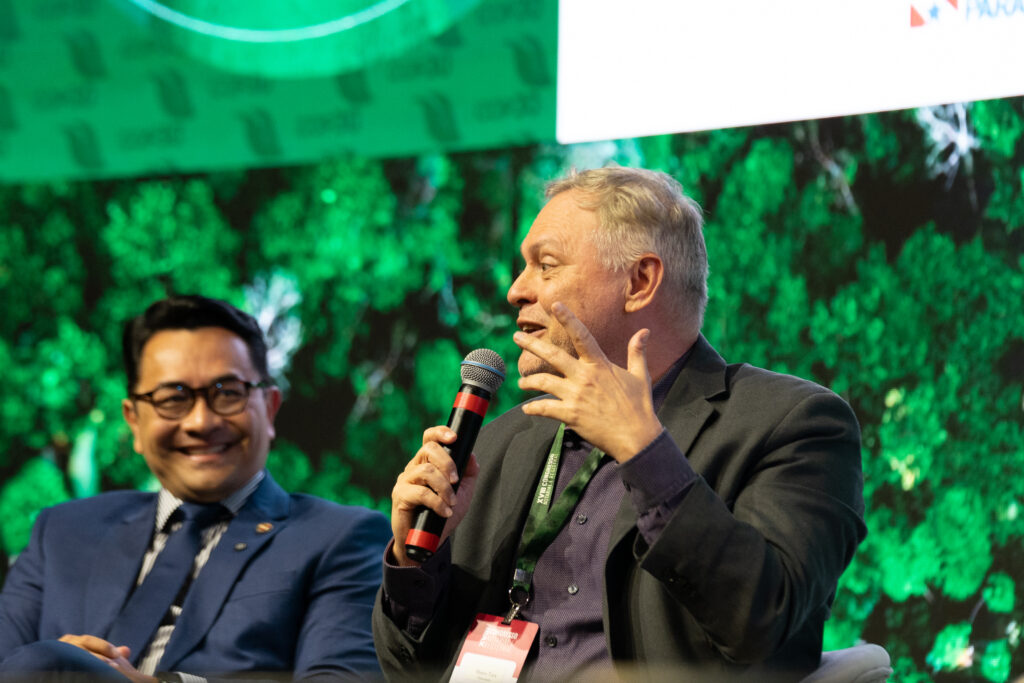 Bruno Kono, presidente do Instituto de Terras do Pará, em sua participação, trouxe a perspectiva da regularização fundiária como elemento central para a segurança e a integridade do mercado de créditos de carbono. Ele explicou o conceito por trás do mercado de crédito de carbono: permitir que produtores rurais, agricultores familiares, quilombolas e comunidades indígenas que protegem a floresta sejam remunerados pelos serviços ambientais prestados. “Abriu uma possibilidade do pagamento, de receber pela proteção que você está proporcionando”, afirmou. No entanto, alertou que essa oportunidade também gerou “oportunismo”.